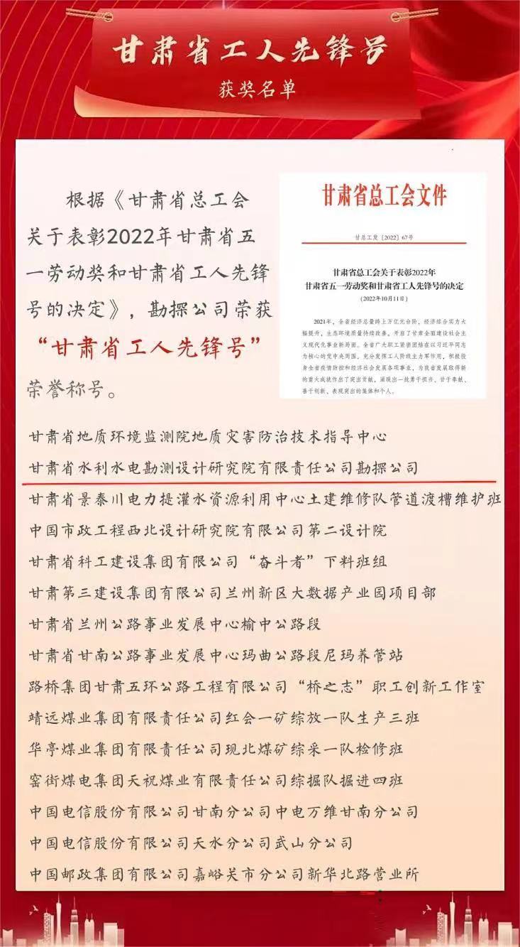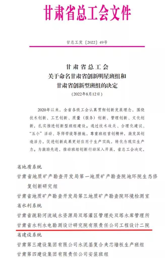 近日,甘肃省总工会发布2022年度“甘肃省工人先锋号”和“甘肃省创新型班组”名单,甘肃省水电设计院的勘探公司荣获2022年度“甘肃省工人先锋号”称号,工程设计二院荣获“甘肃省创新型班组”荣誉称号。