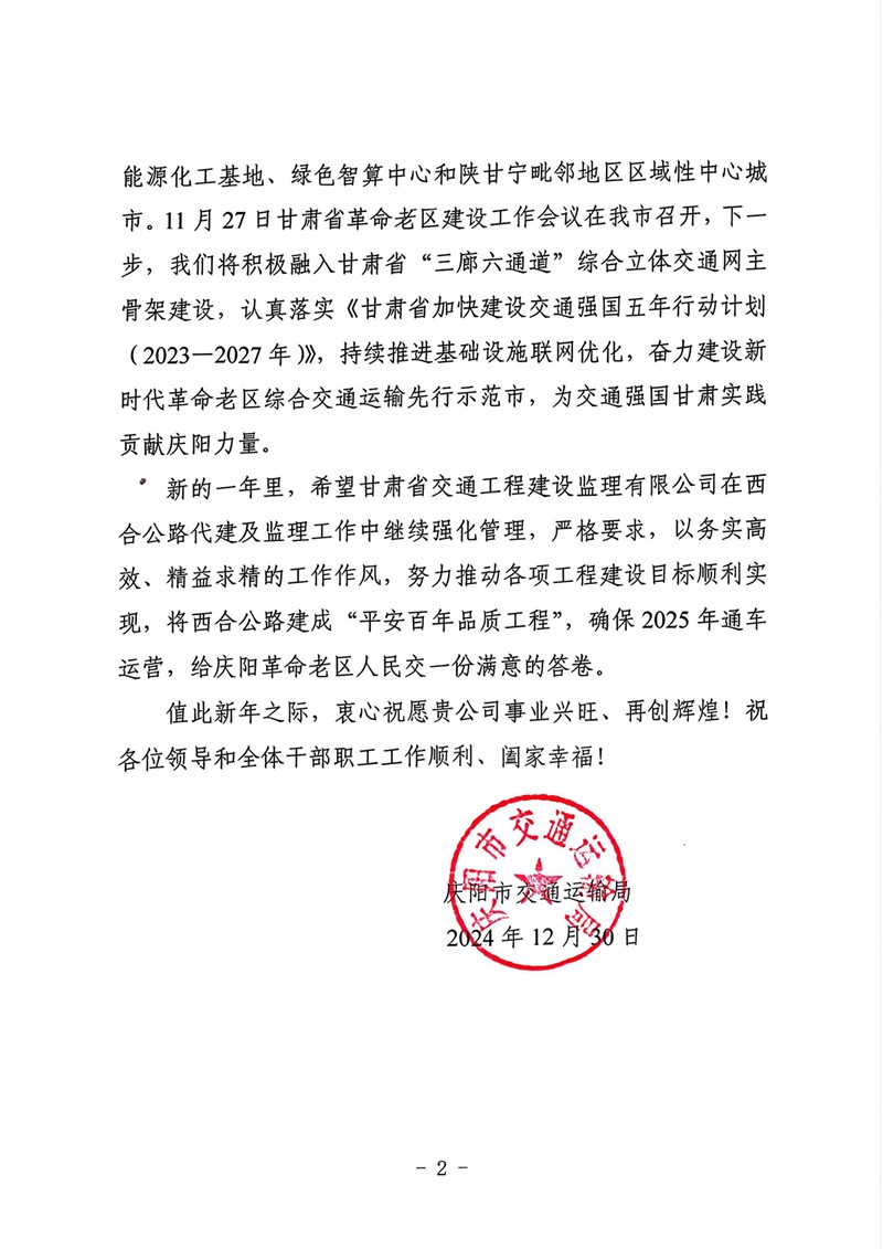 12月30日,米兰网页版登录入口收到庆阳市交通运输局的感谢信,向省交通监理公司在G309线合水(老城)至西峰段公路项目建设过程中作出的贡献表示感谢。